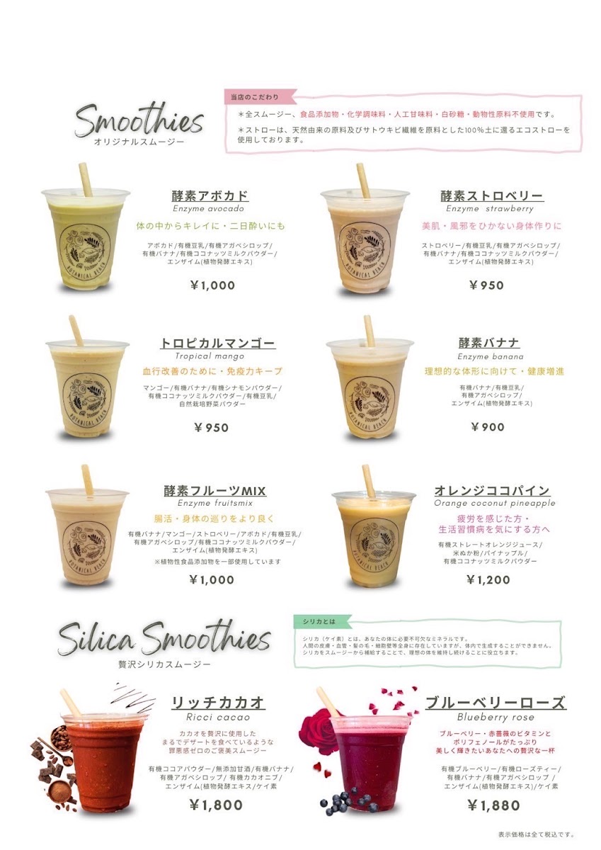 当店のスムージーは、全て白砂糖不使用。また有機豆乳使用をしています。 動物性原料不使用(ヴィーガン対応)となっております。